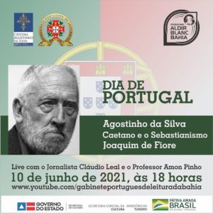 O Gabinete Português de Leitura da Bahia, em parceria com o Consulado Geral de Portugal em Salvador e a Cátedra Agostinho da Silva de Estudos Humanísticos da Universidade Federal de Uberlândia, promove no próximo 10 de junho, dia dedicado à comunidade portuguesa e ao poeta Luís de Camões, às 18 horas, uma roda de conversa sobre Agostinho da Silva e o Sebastianismo na obra de Caetano Veloso, e as influências do pensador italiano Joaquim de Fiori na literatura da língua portuguesa. Participam do encontro o jornalista Cláudio Leal e o professor Amon Pinho. A transmissão será realizada pelo Canal do YouTube do Gabinete Português de Leitura da Bahia.